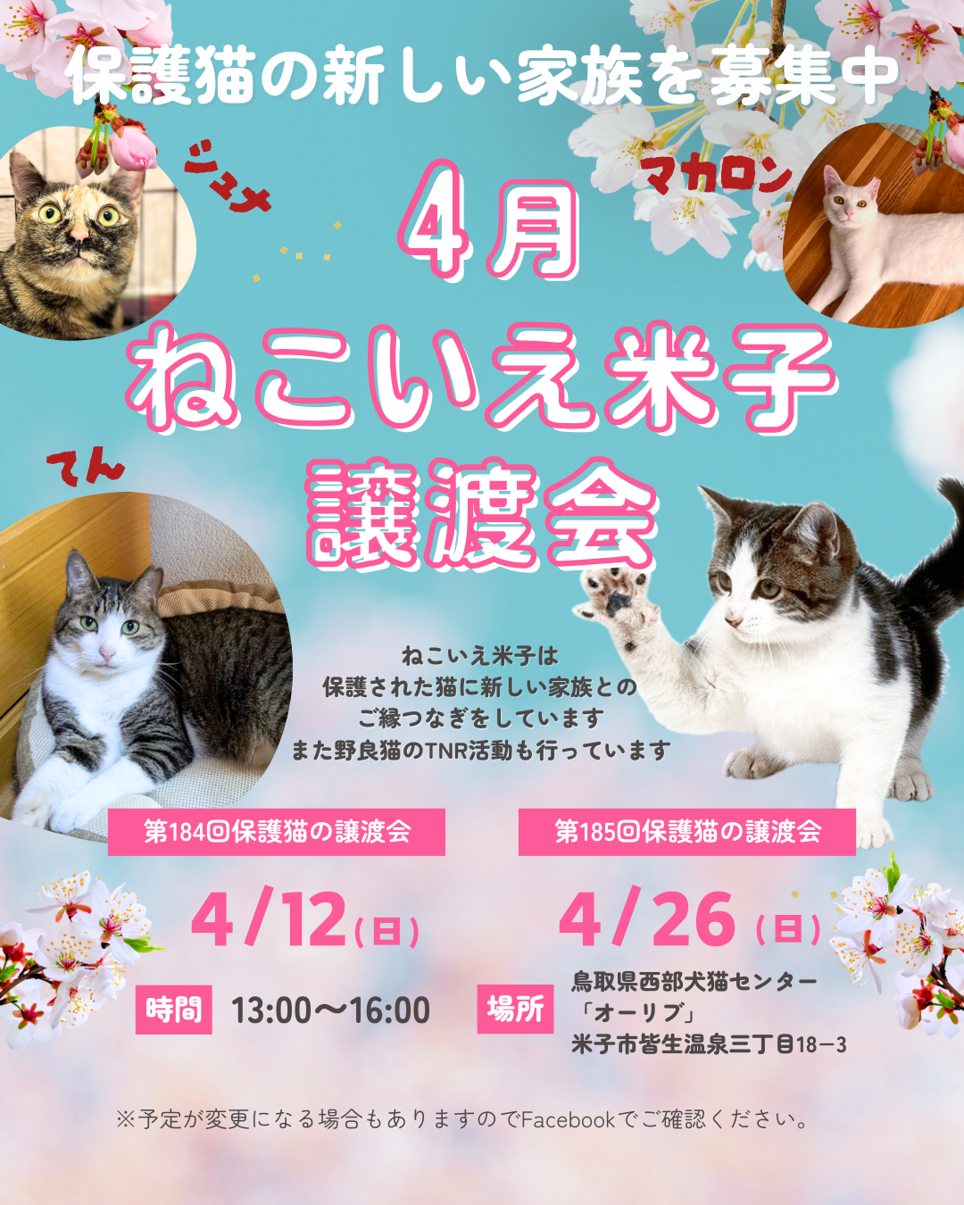 4月12日(日)13時から16時まで会場:鳥取県西部犬猫センター「オーリブ」