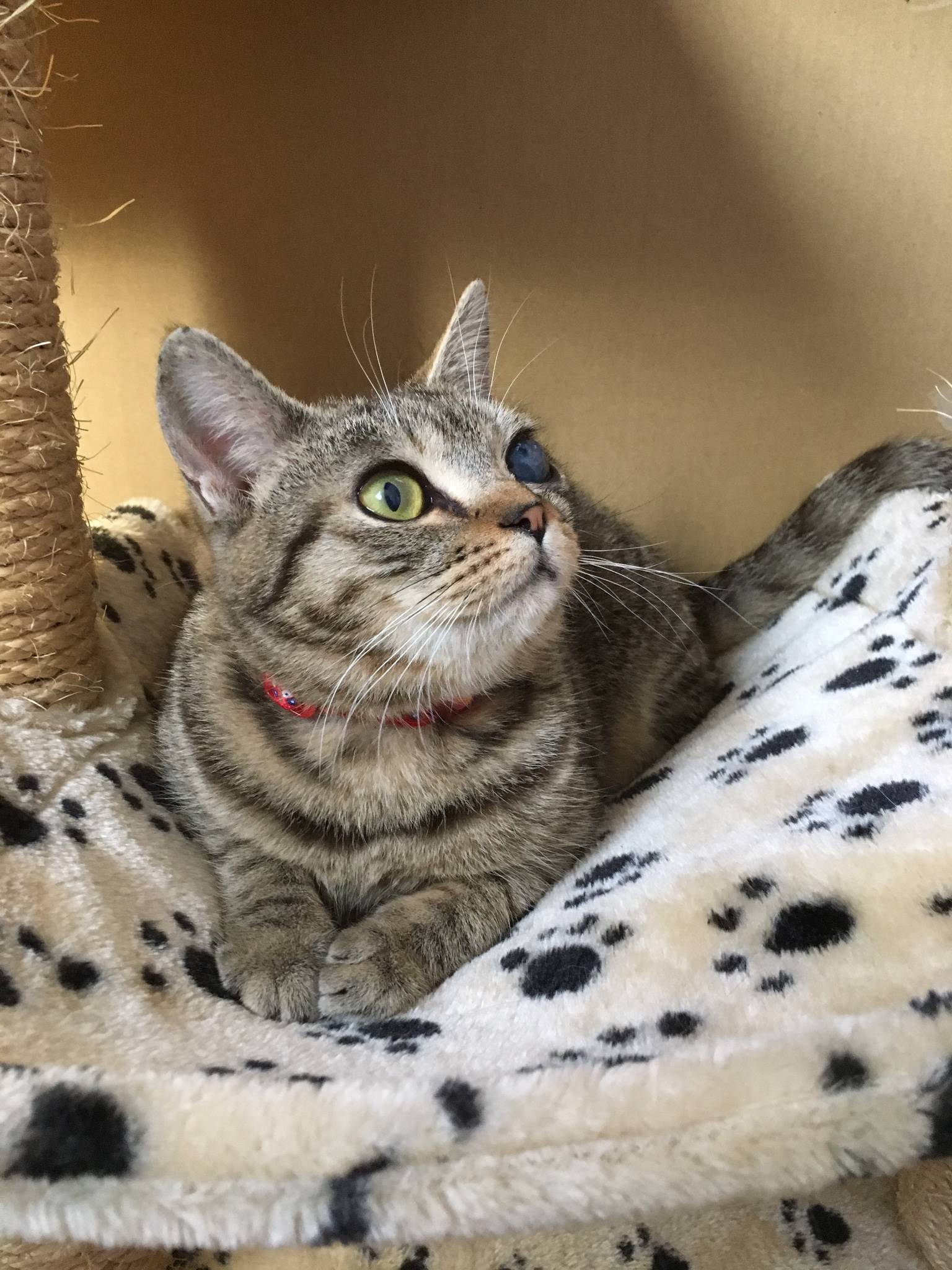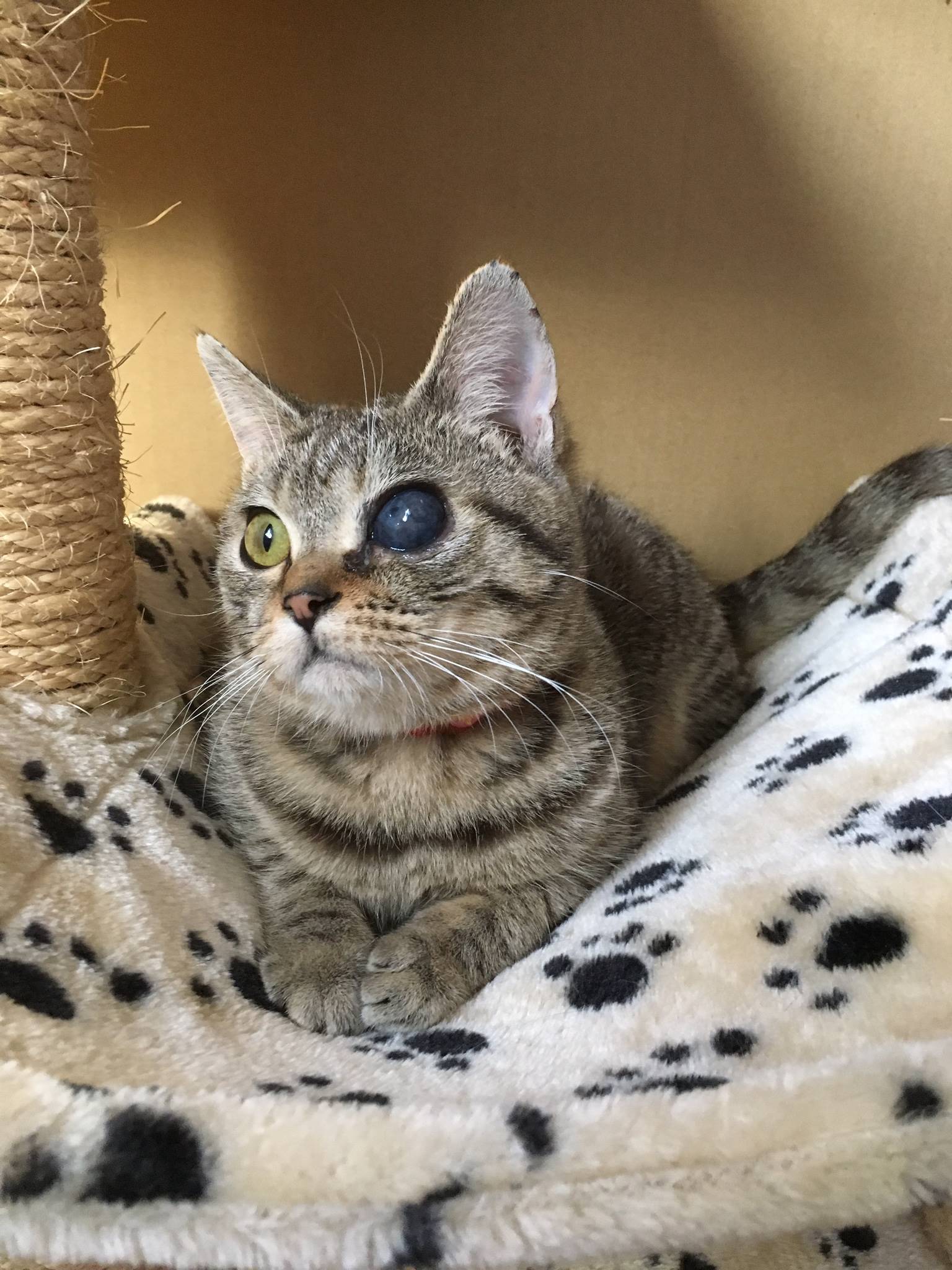 | 性格・特徴 | とても甘えん坊の控えめな子です。 保護した時は眼球吐出しておりましたが、今は自力でまばたきできるほど落ち着きました。 左目は全く見えませんが、日常生活に支障はありません。 |