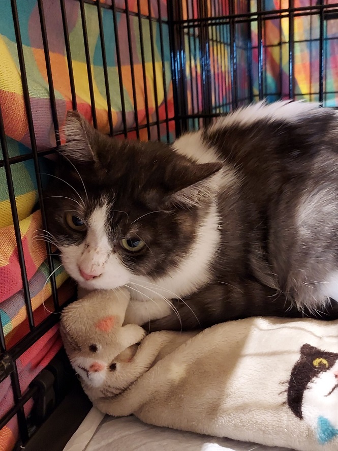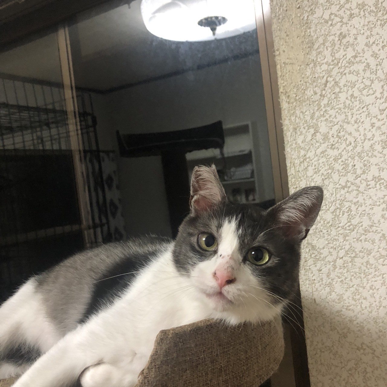 | 性格・特徴 | 物凄い甘えん坊です。 抱っこが大好きで、持ち上げると脱力して身を任せてきます。 外猫のTNR中に捕獲し、去勢して離すつもりでしたが、猫風邪が酷くガリガリだったため保護することになりました。 今ではタプンタプンのお腹で大きくなりました。 遊ぶより甘えたいタイプです。 |