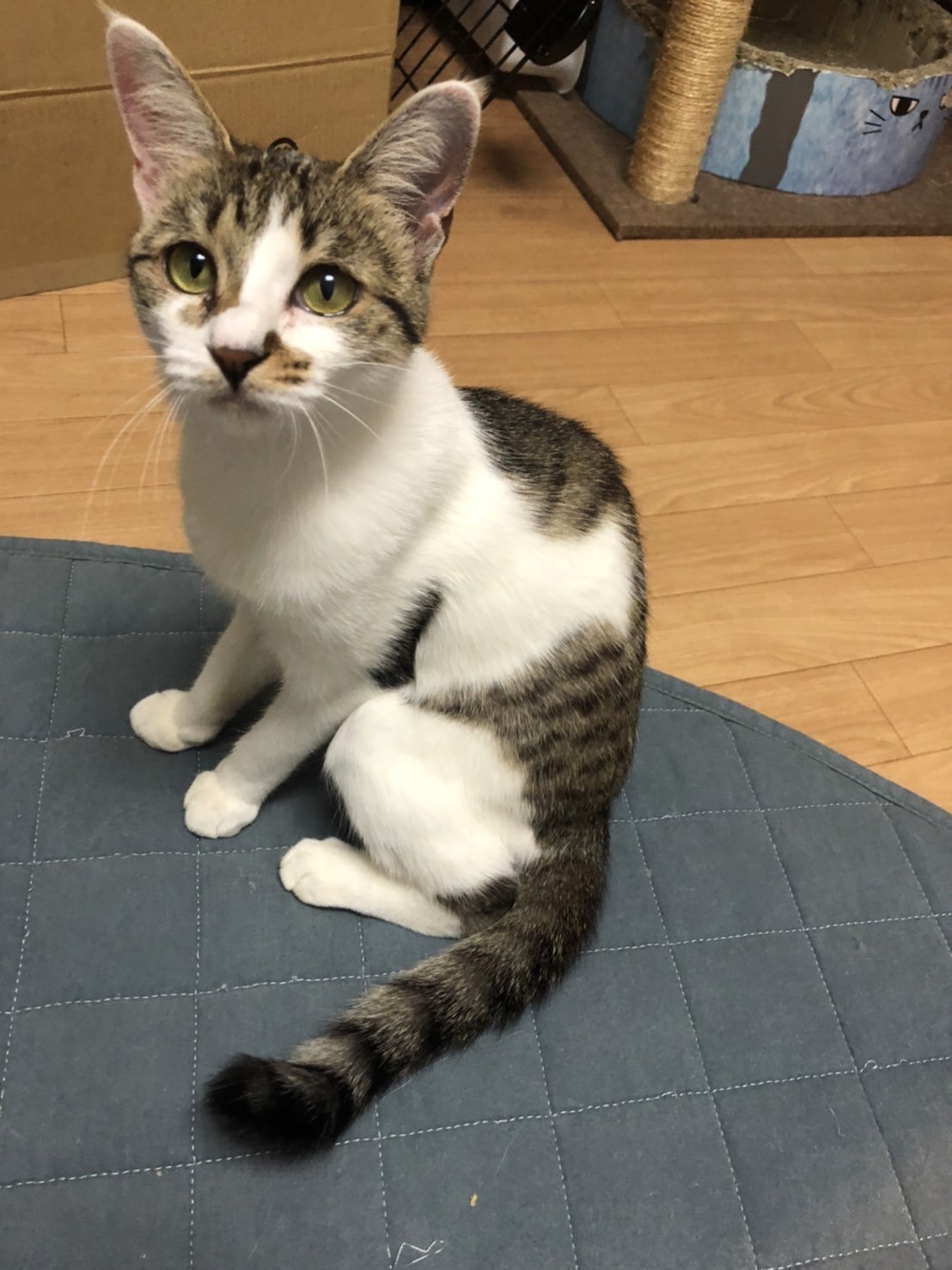 | 性格・特徴 | 保護された時から人にとても慣れていました。 環境の変化に強く、私の家に来た初日に甘えて寛いでいました。 遊ぶことも大好きで、おもちゃがあると飛んで楽しみます。 先にいた猫にかなり強めの威嚇をしていましたが、1週間でお互い舐め合う仲になりました。 |