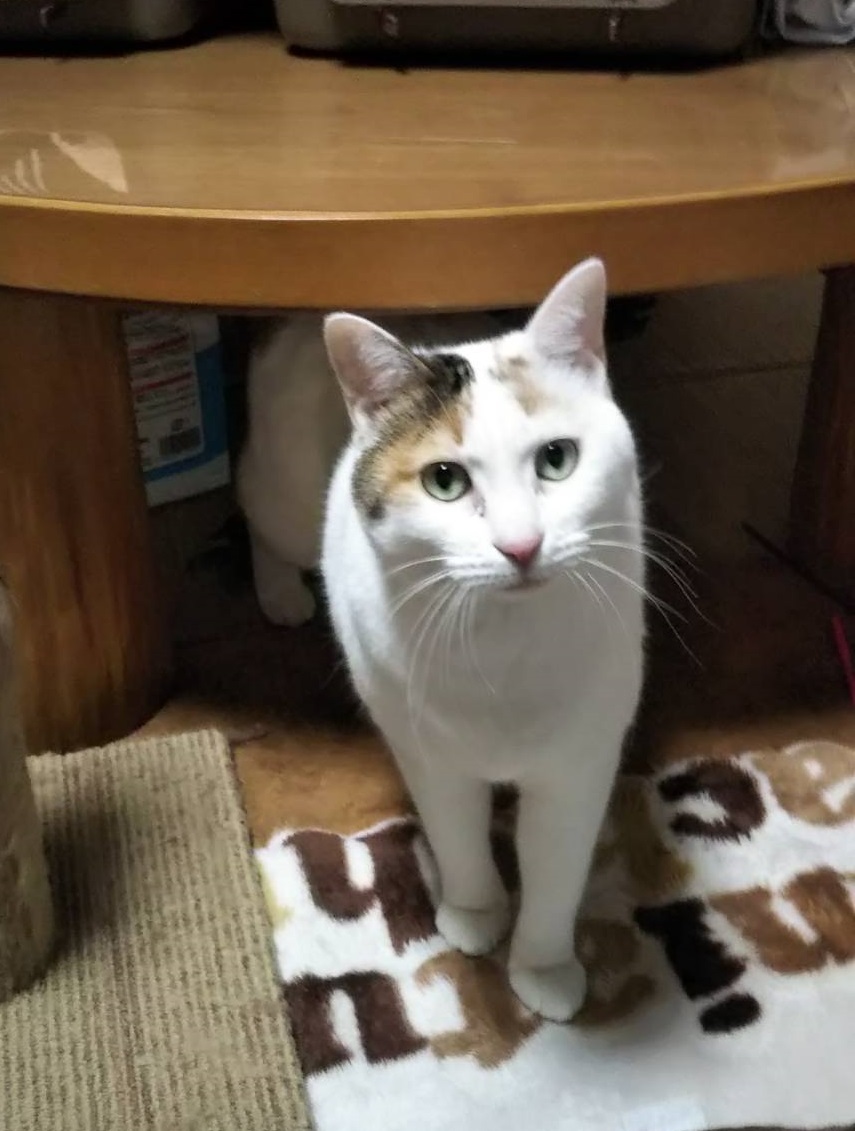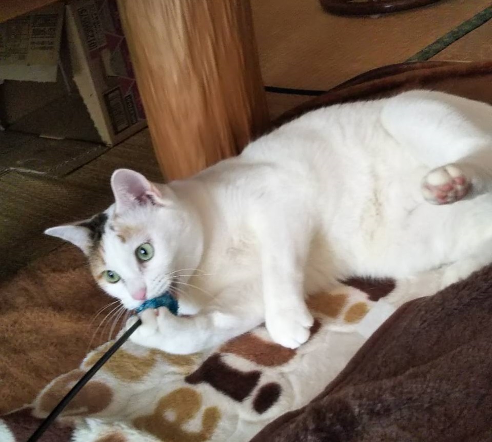 | 性格・特徴 | 三毛の様な感じの短毛で、シッポは先がちょっと曲がってます。 性格はおてんばで好奇心旺盛なお転婆娘です。 スリスリが大好き! |