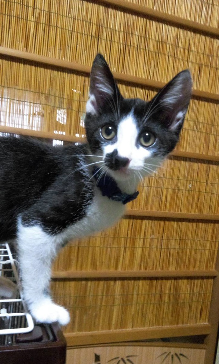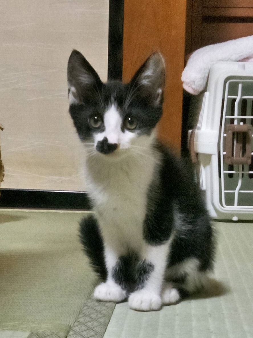 | 性格・特徴 | 人見知りも猫見知りもほとんどせず、とってもフレンドリーです。 紐がたいへん大好きで、紐をくわえると誰にも取られないように遊んでいます。 ハチワレの白の中に、鼻と口にかかる大きな黒い模様がチャームポイントです。 きょうだい猫や同じぐらいの月齢の子と遊んでいます。 |
